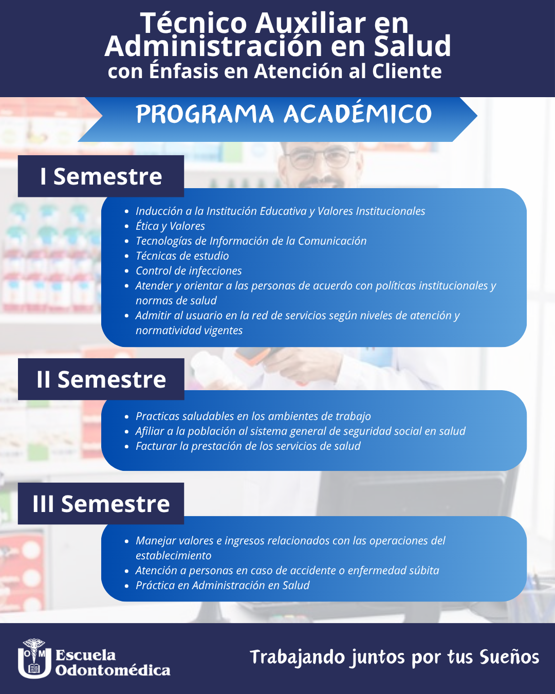 El Auxiliar Administrativo en Salud es aquella persona capacitada en admitir, atender y orientar al usuario en la red de servicios de salud. Desarrollando actividades de facturación y afiliación a la población al sistema general de seguridad social en salud.