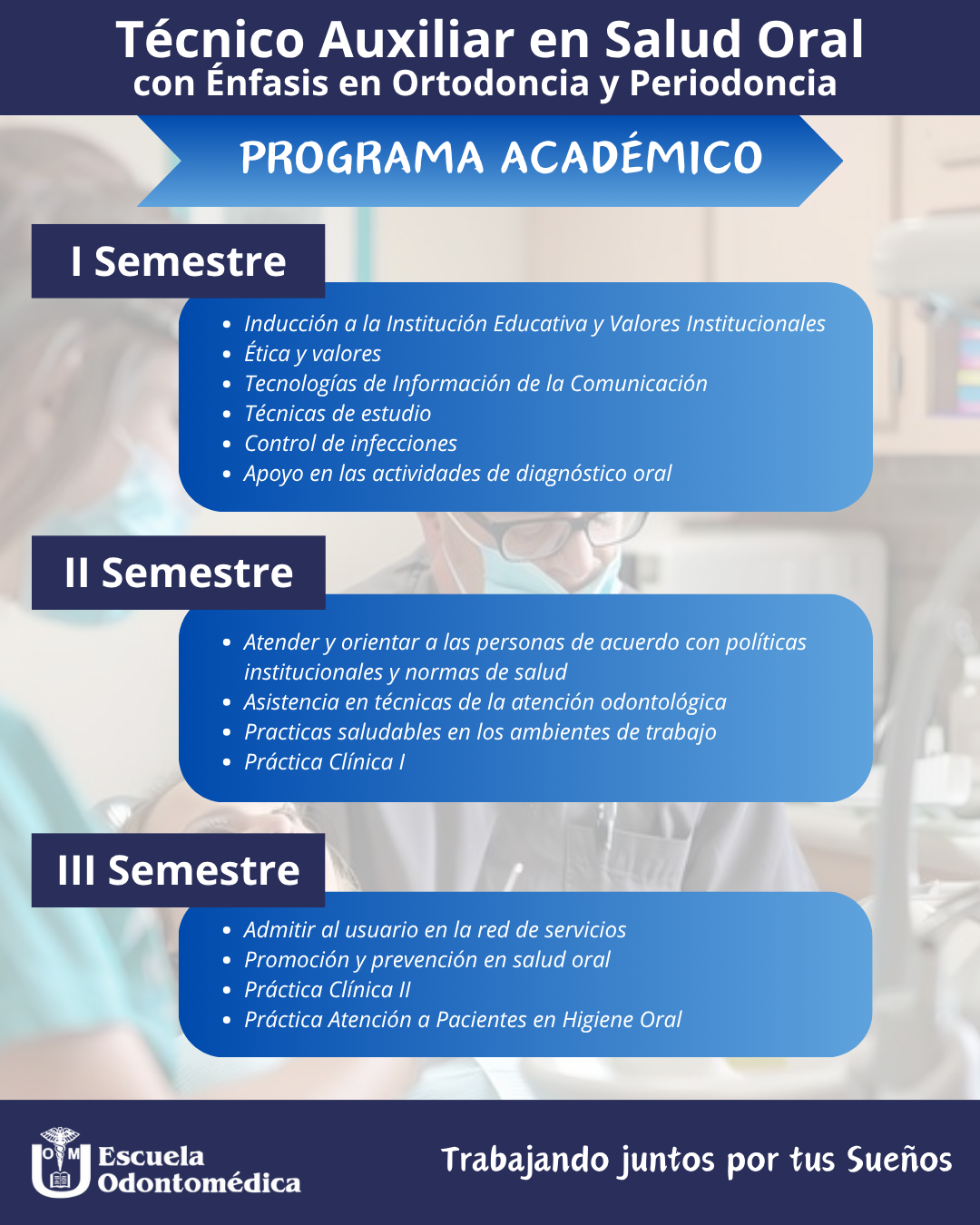 El Auxiliar en Salud Oral, estará capacitado para ser un promotor de la salud oral. Asistiendo al Odontólogo en las diferentes actividades de diagnóstico y tratamiento odontológico. También estará capacitado para realizar sellantes y profilaxis a los pacientes.